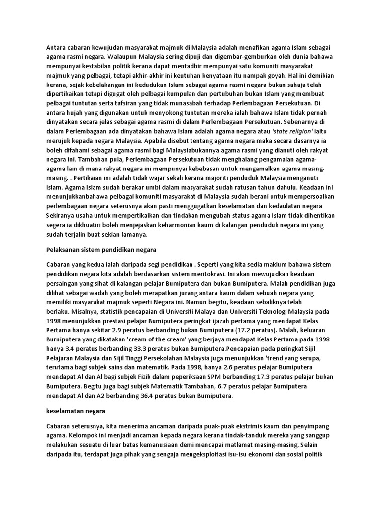 Cabaran untuk mengekalkan perpaduan dan integrasi. Cabaran dai segi pemantapan agama 9. Perspektif sejarah, keluarga dan pendidikan. · keruntuhan akhlak dalam kalangan remaja. Ia jelas menunjukkan bahawa usaha kerajaan dalam menerapkan perpaduan kaum di kalangan rakyat malaysia sejak sekian lama membuahkan hasil keharmonian kaum di malaysia adalah sangat penting bagi mengekalkan kestabilan politik kerana ia adalah perkara penting dalam pentadbiran.