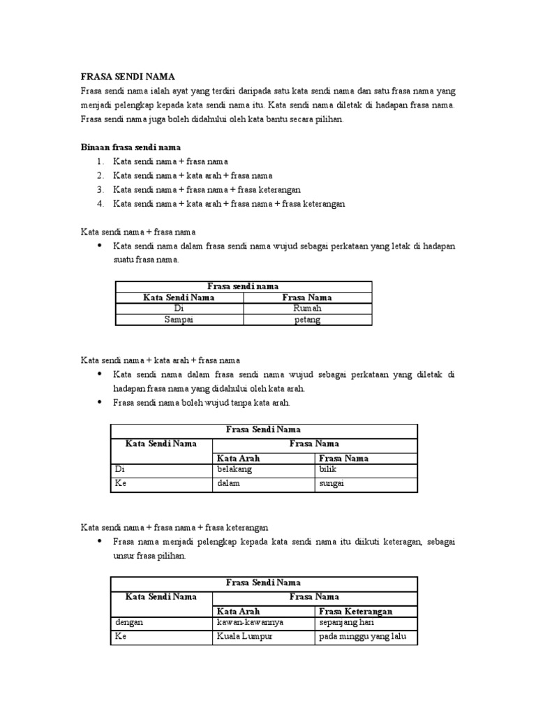 Dalam ayat (1), unsur inti bagi subjek ayat itu ialah frasa nama abang yang hanya terdiri daripada satu patah perkataan. Kata sendi nama + frasa nama + frasa keterangan frasa nama menjadi pelengkap kepada kata sendi nama itu diikuti keterangan, sebagai unsur frasa sendi nama sebagai predikat predikat frasa sendi nama ialah konstituen yang hadir selepas subjek dalam ayat. Salah satu media komunikasi antar perorangan adalah bahasa. Kata sendi nama 'di' dan imbuhan awalan 'di'. Farasa sendi online activity for ppki kssrpk 5. Cikgu nariza 6 months ago. Binaan frasa dalam bahasa melayu terdiri daripada rasa nama, frasa kerja, frasa adjektif atau frasa sendi nama. Zairil azhar bin rozlan 2010301341. Learn vocabulary, terms and more with flashcards, games and other study tools. Frasa sendi nama ialah frasa yang mengandungi satu kata sendi nama dan diikuti oleh frasa yang menjadi pelengkap kepada kata sendi nama. Frasa bahasa melayu terbahagi empat, iaitu: W/bagaimanapun, frasa sendi nama boleh juga wujud tanpa kata nama arah Pola ayat frasa nama + frasa nama.
