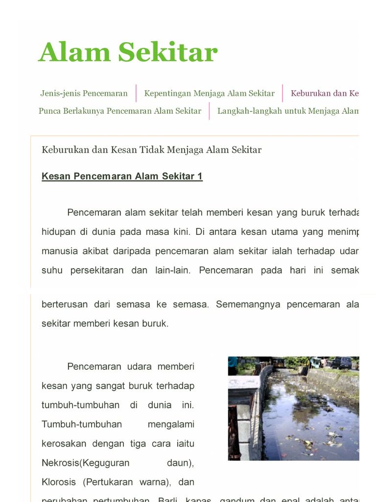 Teknologi Hijau 4 1 Kelestarian Alam Sekitar Kviz from az779572.vo.msecnd.net Oleh sebab itu, mereka harus belajar bertanggungjawab menjaga keadaan alam sekitar dari sekarang jika tidak mahu alam sekitar tercemar dan musnah. Kesedaran tentang perlunya memelihara dan memulihara alam sekeliling untuk mengekalkan keseimbangan ekosistem. .untuk menjaga alam sekitar yang boleh disertai oleh ahli masyarakat adalah melakukan aktiviti sukarelawan membersihkan kawasan sekitar. Hakikatnya, kemusnahan alam sekitar akan membawa malapetaka dan bencana berterusan buat malahan, sekitar 36,000 rakyat britain mati setiap tahun akibat daripada kesan pencemaran udara! Pencemaran air akan menyebabkan hidupan di laut dan di sungai akan mati. Mungkin ramai yang tidak sedar bahawa islam amat mementingkan penjagaan alam sekitar. Alam sekitar telah dianugerahkan dan diamanahkan oleh tuhan kepada manusia. Pencemaran alam sekitar boleh didefinisikan sebagai sesuatu perkara yang mengotorkan alam sehingga boleh menjejaskan ekosistem di muka bumi ini.